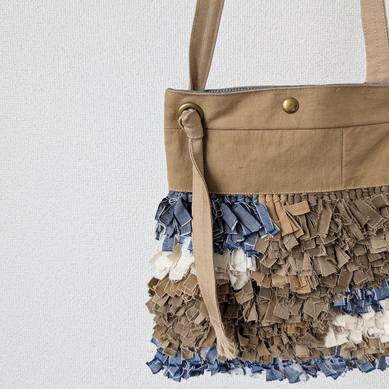 コーヒーの出涸らしで染めた布などで手織りしたフリンジだらけの、唯一無二のショルダーバッグ。布を裂いて、手織りでノッティング織りという技法(ひとつひとつ結んぶ)で生地を織りました。