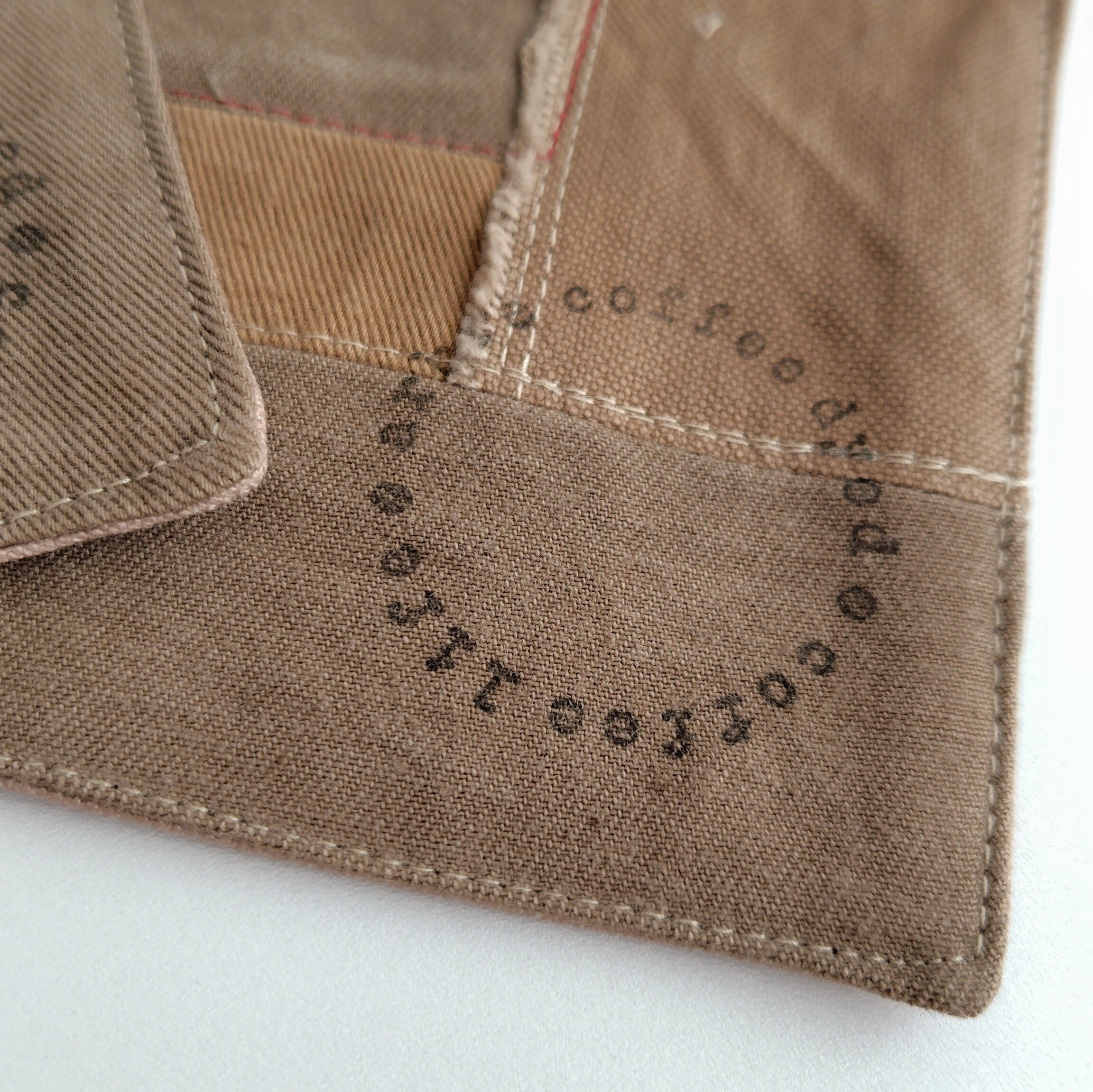 コーヒー染めの色合いの違いが楽しめるつぎはぎをしたコースターは、ランダムに赤のステッチを入れたり、遊び心が詰まった生地となっています。
